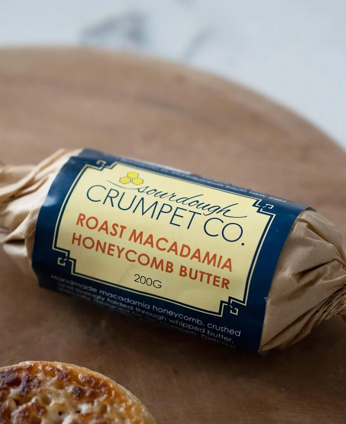 Honeycomb Macadamia ButterRoast Macadamia Honeycomb Butter; Handmade macadamia honeycomb, crushed and then lovingly folded through whipped butter. These 200g logs are rolled by hand and slice into wonderful little discs to melt onto your freshly toasted crumpet. Affectionally known as “crumpet crack” this stuff is highly addictive. You have been warned. Ingredients: Butter, Sugar, Golden Syrup, Macadamia Nuts, Honey, Sodium Bicarbonate, Cream of Tartar Allergies: Dairy, Contains Nuts